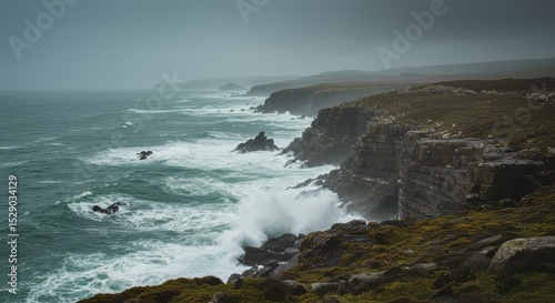 Obraz premium Coastal Cliff Waves Crashing on Rocks, Moody Seascape