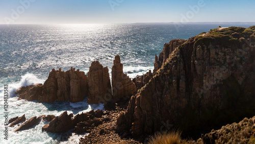 © Ainlie, Fototapeta premium Coastal cliffs overlooking beach and ocean on a clear blue day