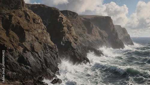 Fototapeta premium Coastal cliffs with crashing waves under a cloudy sky