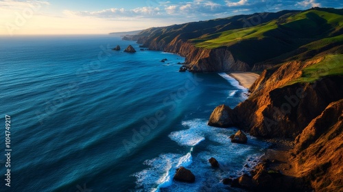 Fototapeta premium Coastal Cliffs with Waves and Birds in the Sky