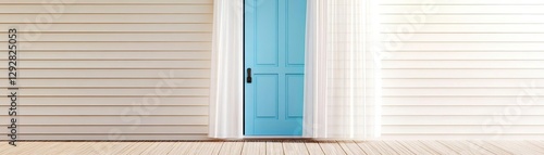 Fototapeta premium Coastal cottage with an open blue door, soft sea breeze moving sheer curtains