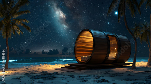 Fototapeta premium Coastal Getaway Under the Stars: A barrel-shaped cabin sits serenely on a sandy beach, illuminated by the warm glow of interior light and framed by swaying palm trees under a stunning night sky