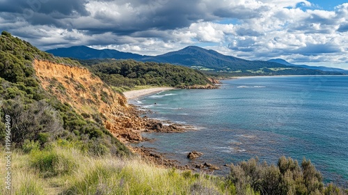 © Berkah1789, Obraz premium Coastal Landscape Featuring Cliffs Beach and Mountains