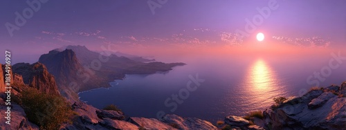 © mryanfahrudin1, Naklejka premium Coastal landscape sunset view with mountains and water reflections