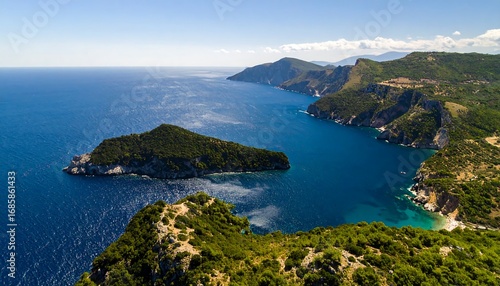 © gelas, Fototapeta premium Coastal landscape with lush greenery, clear water, and a bright sky
