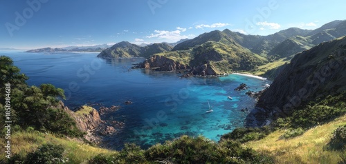 © anis rohayati, Fototapeta premium Coastal landscape with mountains and turquoise water under a clear blue sky