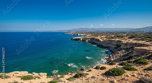 Fototapeta premium Coastal landscape with ocean and cliffs under a bright blue sky