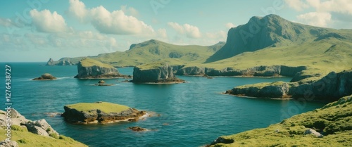 © The 2R Artificiality, Naklejka premium Coastal landscape with rocky formations and green hills under a blue sky with clouds and calm water surrounding the islands.