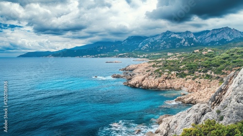 © Katty, Fototapeta premium Coastal landscape with rocky shores, blue waters, and mountainous backdrop under cloudy sky