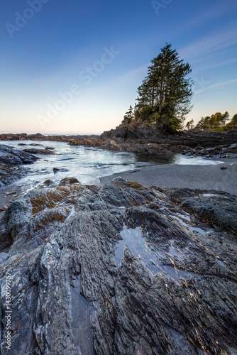 Fototapeta premium Coastal landscape with rugged rocks and trees under a clear blue sky at sunset in Botanical Beach