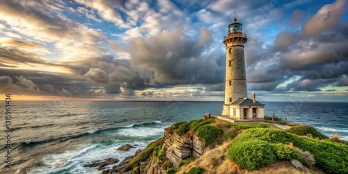 Naklejka premium Coastal Lighthouse at Sunset, Dramatic Ocean Waves Crashing Against Rugged Cliffs, Picturesque Seascape