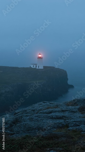 Fototapeta premium Coastal lighthouse glows, foggy night, rocky shore.