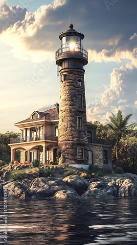 Fototapeta premium Coastal Lighthouse with House at Sunrise
