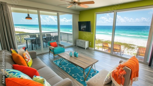 Fototapeta premium Coastal living room with ocean view, comfy sofa, bright decor, and sliding...
