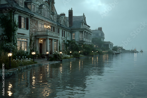 © Prasanth, Fototapeta premium coastal luxury houses with rising tide flooding gardens, sea level rise impact