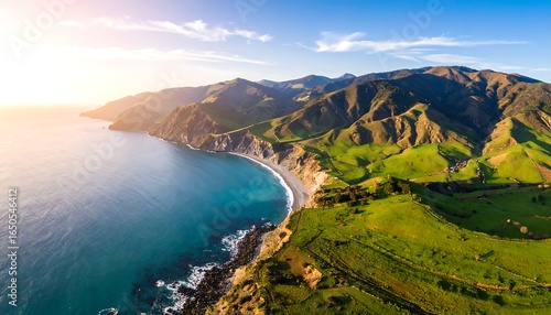 © Joki, Fototapeta premium Coastal mountain panorama at sunset