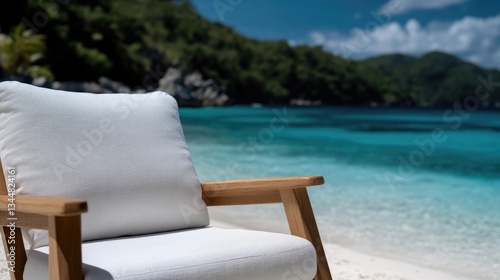 © BROPRADANA, Fototapeta premium Coastal Outdoor Chair with Cushion. Tranquil beach scene with a comfortable, light-colored outdoor chair and pillow. Perfect for relaxation and enjoying the ocean view