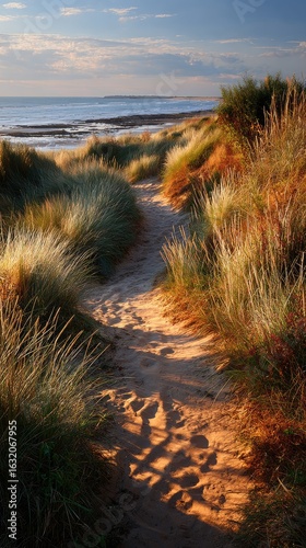 © uwais, Obraz premium Coastal path through golden dunes at sunset