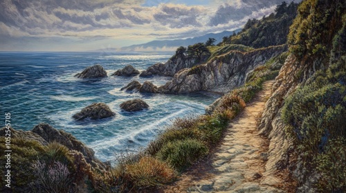 Obraz premium Coastal Path Winding Through Rugged Cliffs and Ocean