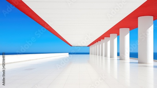 © PAPAHJAHATZ, Fototapeta premium Coastal Red-White Colonnade; Summer Ocean View; Architecture Design