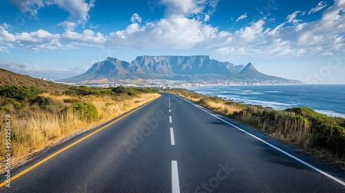 © The Little Hut, Fototapeta premium Coastal Road At Cape Town In Western Cape South Africa Table Mountain Landmark Freeway Road Cape Town At Western Cape South Africa Tourism Travel Road Trip Skyline : Generative AI