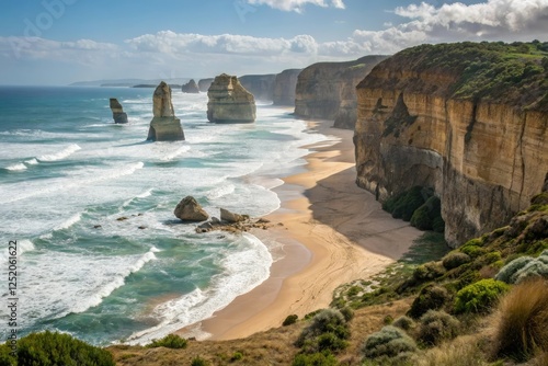 © Phetthanousack, Obraz premium Coastal scene with beach, cliffs, and ocean waves, driftwood, wave, weathered wood, coastal