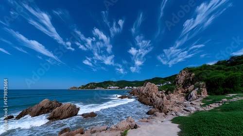 © moon_, Obraz premium Coastal Serenity Dramatic Cloudscape over Rocky Beach.