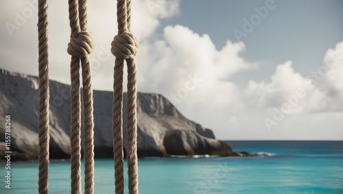 Fototapeta premium Coastal Serenity: Knotted ropes against a breathtaking turquoise ocean and...