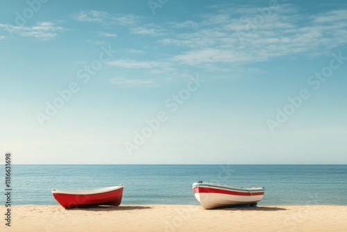 Fototapeta premium Coastal Serenity: Two small fishing boats, one red and one white, rest on a tranquil sandy beach under a clear blue sky. The scene evokes a sense of peace and serenity.