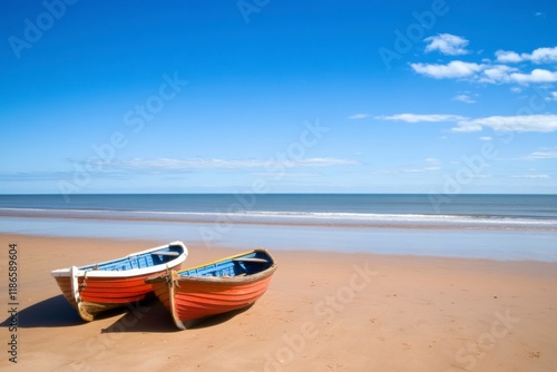 © SSTC AI Photo&Video, Naklejka premium Coastal Serenity: Two vibrant fishing boats rest on a tranquil sandy beach, under a brilliant blue sky dotted with fluffy white clouds. The calm ocean stretches out to the horizon.