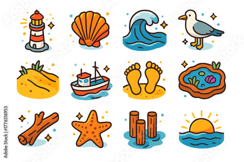Fototapeta premium Coastal Sunrise Icons. coastal sunrise. Colorful isometric vector icons set of coastal sunrise: lighthouse, seashell, crashing wave, seagull, sandy dunes,