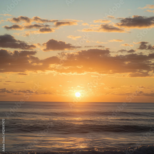 © Achiro, Naklejka premium Coastal sunrise over the ocean, soft waves catching the warm golden light