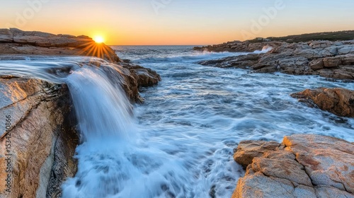Obraz premium Coastal sunrise, water cascading over rocks into the ocean