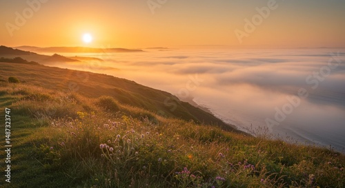 © AleniaFlow, Obraz premium Coastal Sunrise with Fog and Wildflowers