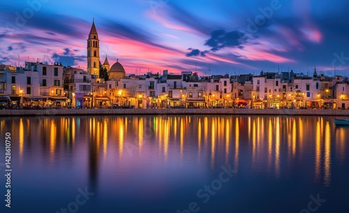 Obraz premium Coastal town at sunset, lights reflected on calm water