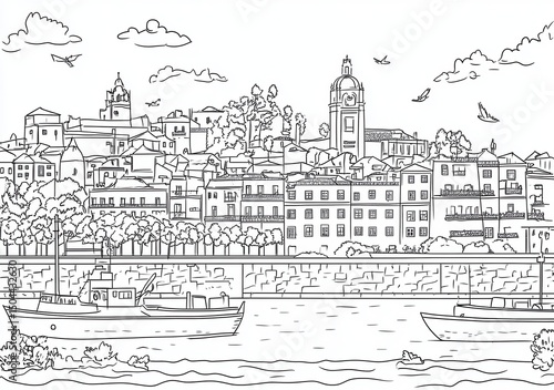 © LeNo, Fototapeta premium Coastal Town Line Art Illustration