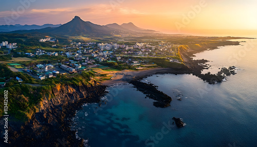 © mukuro, Obraz premium Coastal Town Sunset Aerial View