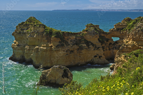 Fototapeta premium coastal view with golden cliffs, sandy beach, and turquoise ocean waves. The cliffs feature layered rock and sparse vegetation, with buildings visible on top in Portimao, Algarve, Portugal