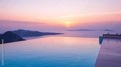 Obraz premium Coastal villa featuring an infinity pool glowing under sunset hues, sleek...