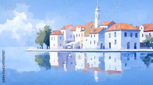 © Alpha, Obraz premium Coastal village at dusk, multicolored homes reflecting in the calm waters, soft waves lapping, oil painting style with rich textures and warm hues