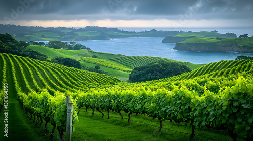 Fototapeta premium Coastal Vineyard Rows at Sunrise