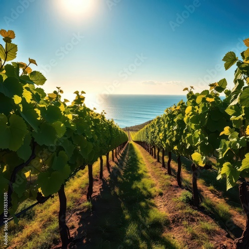 Naklejka premium Coastal vineyard with grapevines, sun-drenched rows overlooking ocean, cliff,...