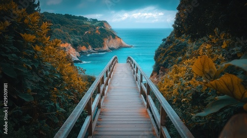 © Dece Std, Obraz premium Coastal Wooden Bridge Pathway to Ocean Vista