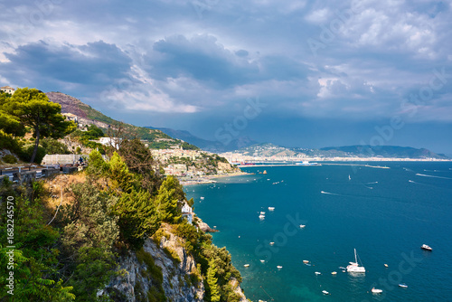 Obraz premium Coastline Scenery: Adriatic Sea, Greenery Hill, Boats Sailing