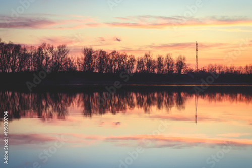© technobulka, Obraz premium Coastline sunset reflection with power lines