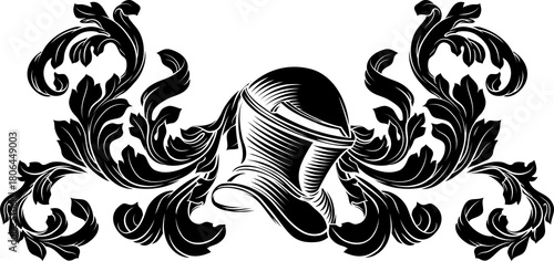 © Christos Georghiou, Obraz premium Coat of arms crest knight family medieval shield heraldry heraldic armorial motif. Featuring a knights helm helmet in a vintage etching engraving woodcut style