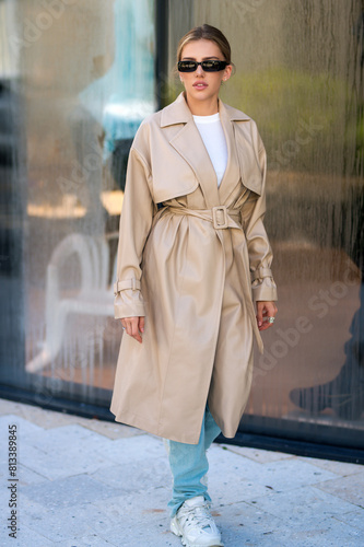 © Volodymyr, Fototapeta premium Coat. Outdoor lifestyle portrait of pretty young fashion model in urban background. Outdoor elegant fashionable woman walking in street. Summer lifestyle portrait of stylish girl wearing trendy outfit