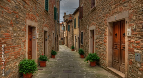 © Ijo, Fototapeta premium Cobbled alleyway flanked by brick & stone buildings with wooden doors & potted plants