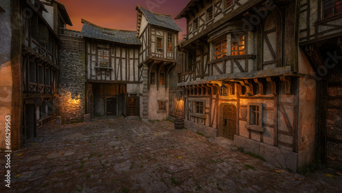 Obraz premium Cobbled street in a medieval fantasy town in evening light. 3D rendering.