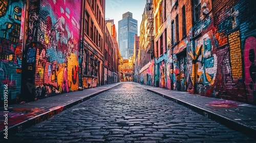 © arsyi_06, Fototapeta premium Cobbled urban alley with vibrant graffiti art and city view.